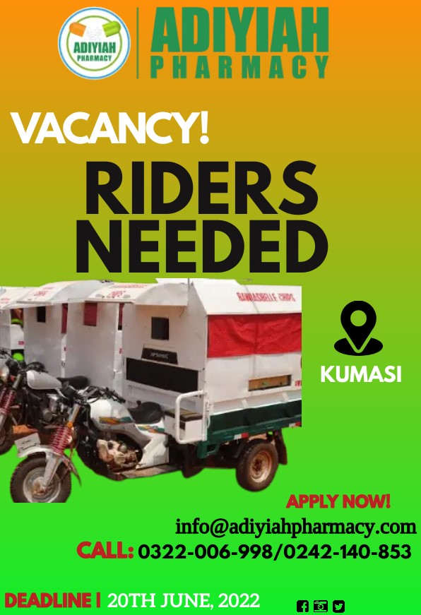 ADIYIAH PHARMACY LTD in Kumasi Metropolis requires the services of a hardworking TRICYCLE RIDER with driving and a valid driving license is required for immediate employment.